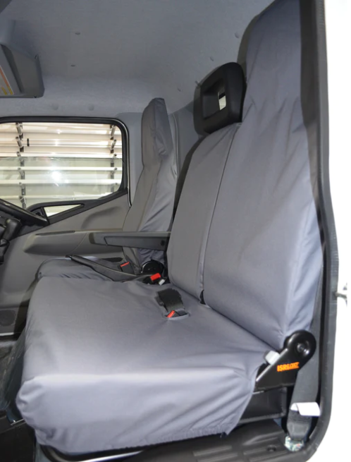 Fully tailored waterproof seat covers to fit the Mitsubishi Fuso eCanter 2006, 2007, 2008, 2009, 2010, 2011, 2012, 2013, 2014, 2015, 2016, 2017, 2018, 2019, 2020, 2021, 2022, 2023.