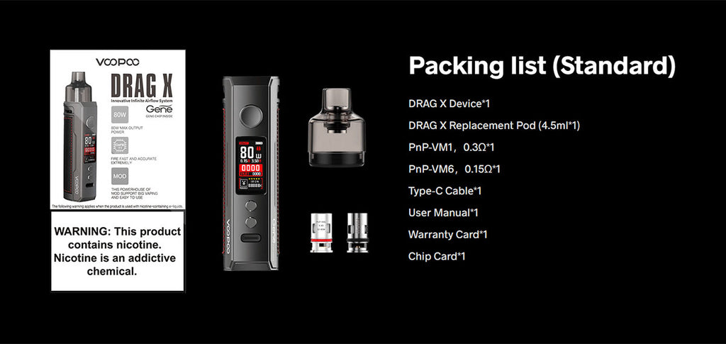 1 x Drag X Device, 1 x Drag X Replacement Pod 4.5ml, 1 x PnP-VM1 0.3ohm, 1 x PnP-VM6 0.15ohm, 1 x Type-C Cable, 1 x User Manual, 1 x Warranty Card, 1 x Chip Card
