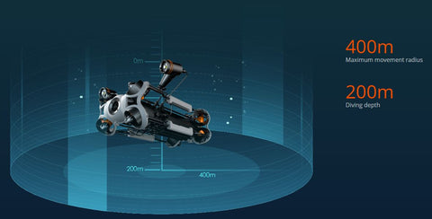 The maximum diving depth is 200m and the maximum movement radius is 400m. With different lengths of tethers, the ROV can meet needs of more application scenarios and be operated in a wider range.