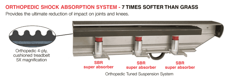 The Orthopedic Shock Absorption System provides the ultimate reduction of impact on joints and knees by providing an orthopedic treadbelt and softer shock absorbers. This system is seven-times softer than running on grass and is covered by the Landice Lifetime Warranty.